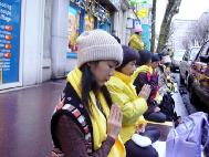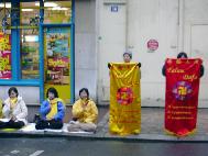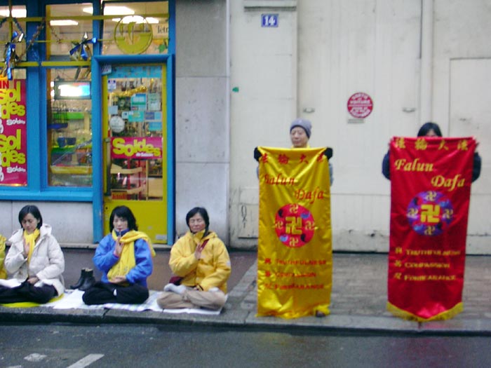 法轮功学员除呼吁社会各界鼓励、支持法轮功学员的正当权益,捍卫“自由、平等、博爱”原则外。又冒着寒冷的天气来到中国驻法总领事前抗议,要求中国停止这场由江××发动的这场对法轮功及其修炼者的迫害。