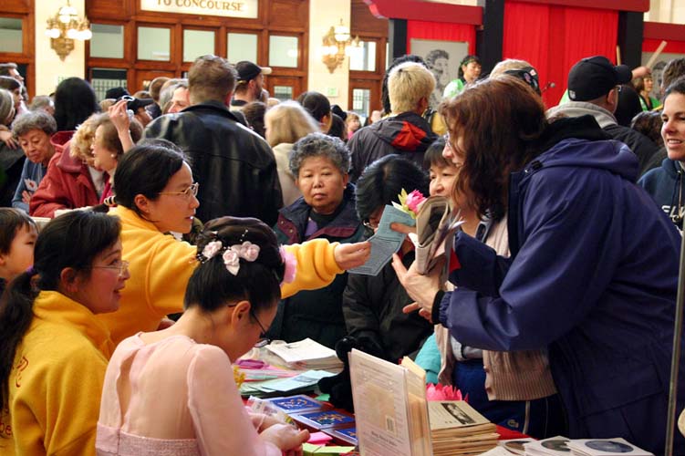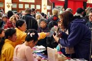 法轮大法的展位上摆放了印有“真善忍”和“法轮大法好”等的手工艺品,还有制作精美的各种语言的讲真相的VCD。和别的展位比较起来,这里的人是最多的,有不同肤色,不同种族的人们。他们排队索取学员们精心制作的莲花和各种真相材料。人们愿意和学员们深谈以进一步了解法轮大法。很多人签名要求中国政府立即释放被关押在中国的法轮功学员李祥春医生。
