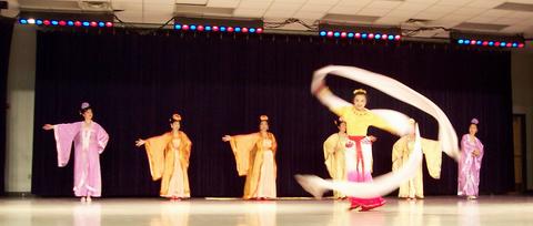 最后一个节目,是由几位女学员编排的舞蹈。学员们身着高雅、华丽的唐装,在音乐声中如仙女般飘然而至台前,令观众耳目一新。在悠扬舒缓又起伏跌宕的音乐中,她们时而如漫天彩云飞绕于天上,时而又如威武的壮士,于世间助师正法,浩气凛然。在音乐结束的高潮中,学员们打出了“法轮大法好”的英文横幅,赢得了观众阵阵掌声,使得整个活动达到了高潮。