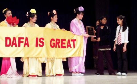 表演结束后,学校给学员们颁发了褒奖,感谢对他们活动的贡献及带来了这么好的中国的传统文化。在结束后,一个华裔中学生碰到身着炼功服的学员时用中文说:“法轮大法好”!
