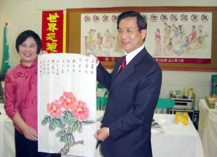 章翠英女士现场挥毫,以一幅牡丹富贵图赠予市长,感谢许市长一直对法轮功的支持,并祝愿台南市市民拥有美好的未来。