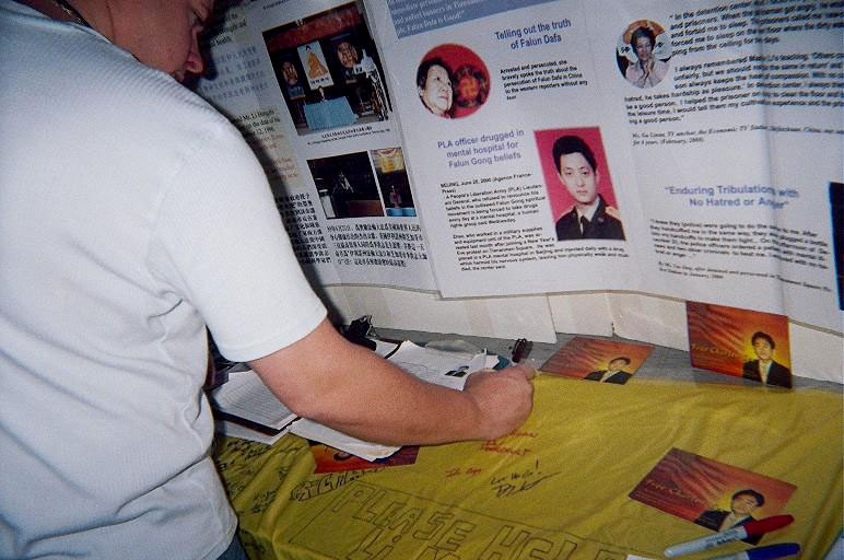 这一旧货市场是佛罗里达州最兴隆的一个,估计有一万二千人常去光顾。我们的摊位正好位于人流量高的地方。学员们用请愿表和在一个大的黄色横幅上签名的方式把李祥春的情况和法轮功介绍给大众。我们的摊位与一家由友善的中国人经营的折扣店挨着。每一次我们去这家店买东西的时候,都向店家介绍法轮功。他们也知道中国的情况。尽管他们没有签名,但他们支持法轮功。有趣的是,那家的顾客常常到我们的摊位来付款,我们让他们去店主那儿付钱。在对诚实的理解上,我们的心性是扎实的。就诚实而言,他们在我们的身上直接看到了法轮功学员是什么样的人。