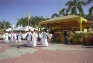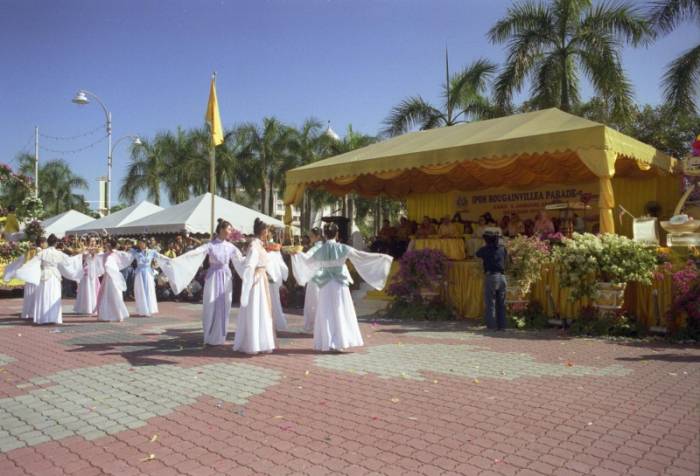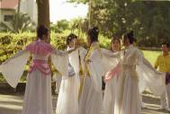 | 50位身穿黄衣手捧九重葛的学员们 | 学员们在霹雳苏丹陛下台前起舞 | 天女散花 |