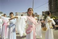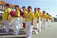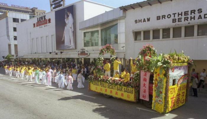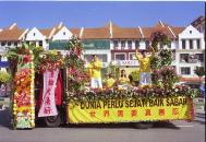 法轮功的队伍是游行中唯一有华人传统风格的。怡保的华人市民有些看到我们的花车、仙女和‘法轮大法好’时露出惊喜的表情。学员们也随队伍沿路发介绍法轮功的真象传单。