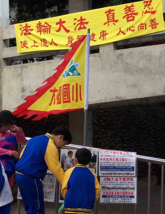2004年元月三日,一个艳阳高照的朗朗冬日,一些台湾北桃园的大法学员来到大园乡的大园国小,共同参与该校师生为庆祝建校百周年扩大庆祝活动,并为来宾演示了法轮功功法。