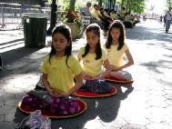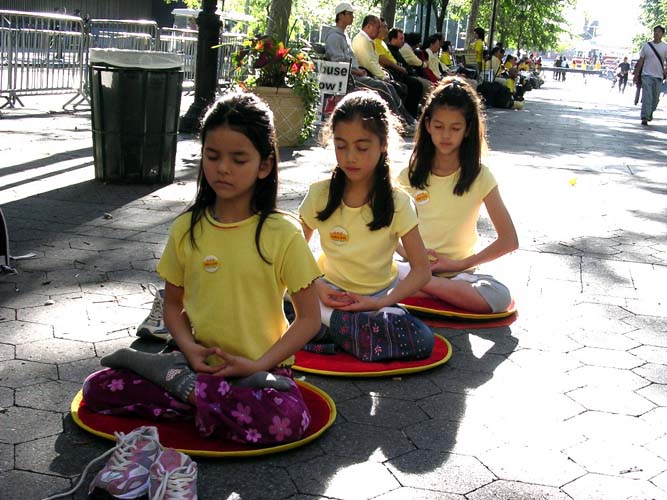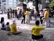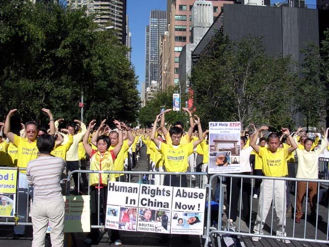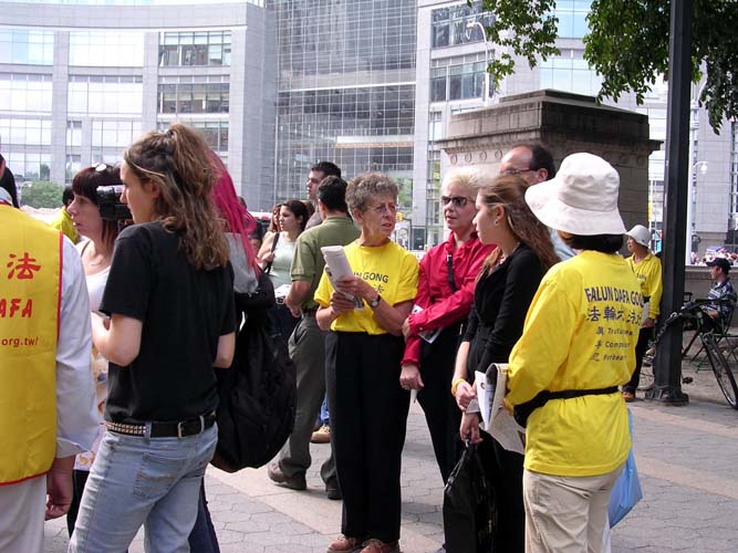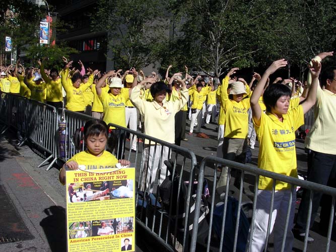 【明慧网2004年10月1日】(明慧记者综合报导)近日来,在纽约曼哈顿各个街角、旅游景点、公园及人潮聚集处,穿着黄色衣服,炼功或举着展板向路人说明法轮功真象的法轮功学员,俨然成了纽约的另一个特色,同时也成了人们关注的焦点。