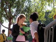 人们接过法轮功学员的资料,仔细的阅读着,一波波的人潮靠近法轮功学员,进一步了解真象,同时表达他们善意的支持。人们与法轮功学员的互动,象征着一股善的、正义的力量正在凝聚。