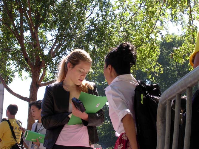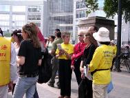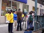 也有人问法轮功学员,为什么站在这里,告诉人们这些事情?学员告诉他们,因为中国大陆封锁所有法轮功真实的消息,并操控媒体散布对法轮功污蔑的消息,使世界上的人不了解法轮功在中国大陆被江氏集团打压迫害的真实情况。所以,法轮功学员才会用自己的时间与金钱,自发的到这里来向人们讲清真象。