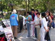 经过法轮功学员近两个月来努力不懈的讲清真象,纽约曼哈顿地区愈来愈多的人们明白了法轮功的真实情况,人们口耳相传的谈着法轮功被迫害的真象。很多路人对法轮功学员点头致意,竖起大拇指表示支持,有的人被法轮功宁静祥和的音乐与功法吸引,希望马上来学炼。曼哈顿讲清真象的效应正在蔓延,并持续在扩散着,诚如一位来自迈阿密的人权组织成员对法轮功学员所说“我与我的组织,对于你们为人权所做的努力,表示由衷的敬佩,让我们聚集大家的力量,早日制止这场残酷的迫害。”