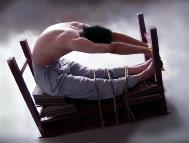 将桌子翻过来将大法学员绑上坐“老虎凳”。腿中间用绳子勒紧,将手用胶带缠在脚尖上。然后往臀部下、脚下垫几个马扎子,使两头向上翘,骨头就象断裂似的难受。恶人此种酷刑折磨大法学员姜国波长达一整天。