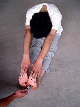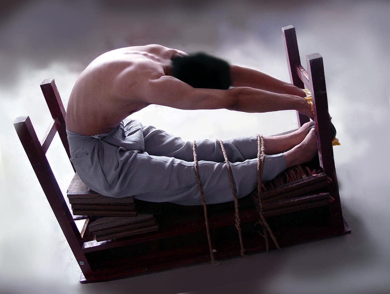 捹脚尖:逼迫学员长期坐在地上伸直双腿,用两手去扳脚尖,捹不住就拳打脚踢,还用胶带将手缠在脚尖上。