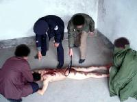 2000年严冬时节,昌乐劳教所恶警为了强制学员“转化”,指使7、8名劳教人员将大法学员扒光衣服(一丝不挂)抬进厕所,把学员按倒在地,4、5个人按着头、胳膊,两个人站在腿上踩着,两个人用水管子喷灌,另有两个人用水桶不停地泼,致使大法学员(姜国波)昏死……。(注:当时是十几个人在洗漱间、厕所内折磨的,因条件所限此图改在露天拍摄)