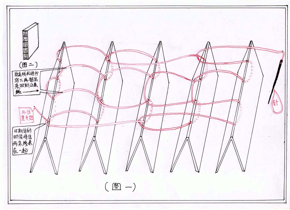 三, 用比较结实的细线按照(图一)那样把14组装订在一起(注:图一中的虚线代表订在书下面的部分,按照虚线就能找到整个这条线的走向。),要尽量将线拽紧一些使各组紧紧的成为一体,这个环节非常重要。订完后,用胶糨糊(一般的商店都有)将书顶涂满糨糊,然后用重物把涂完糨糊的书压紧,一直到糨糊干了为止。下一步就是用药店买的绷带在书顶脊上粘上一条,这样更能使装订的书坚固,和印刷厂的正规装订方法是一样的。接着再把《转法轮》后面的小节、目录、论语、法像和书皮儿粘上,再压紧。等完全干了后,用能一次切四五百张纸的大切纸刀(大切纸刀的价钱在300元左右)将书的三面切齐,这样一本新书就做出来了,几乎和我们的原装书一样好,而且这种装订方法做出来的书既美观翻看又非常方便,不象用订书器订出来的书翻看非常费劲。