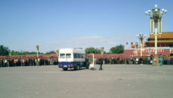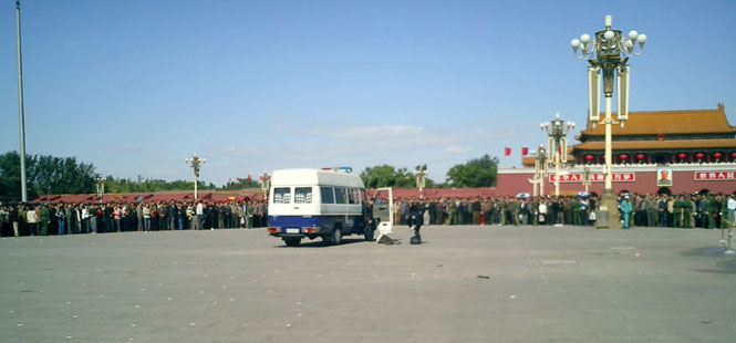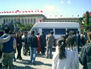 我立即随着他们的方向追赶过去。当我赶到的时候,就只见这位法轮功学员被警察打得蜷缩在地上,警察的手上还缠绕着法轮功学员刚刚举过的横幅。武警把围观的人群隔开得很远,但现场的大量群众还是都见证了国庆节这天警察在天安门广场上对法轮功学员施以的暴行。人群中有好多人都举起照像机将恶警们的罪行拍摄下来。几位得以较近距离拍到现场情况的游客都被警察强行将底片抢走,有的连包中没用过的空白胶卷都被抢走。同时还有几位拍摄照片的游客也被强行带上了警车,四周的警察也在翻查是否还有带像机拍照片的人。