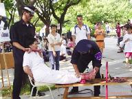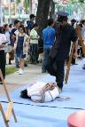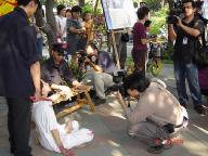 黄先生夫妇看着演示的学员关心问说:“这场迫害到底死了多少人呀!虽然只是演示,可能也会很痛吧,有人可以替换吗?”
