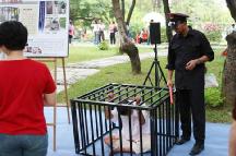 许伯伯谈到演示“关小牢笼”,身体整个弯曲全身都很痛,一想到中国法轮功学员长期被关在小牢笼里,眼泪忍不住直流,眼前一双双驻足看真象的脚,体会到以演示让人们明白真象是一件很神圣的事。