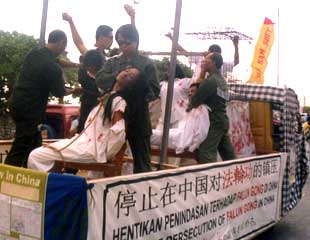 法轮功学员把最靓丽、最美好的形象展现给世人,吸引了几万名观众和国内外游客。同时,学员们也展示了中国法轮功学员被残酷打压的画面,告诉世人在中国的法轮功学员正遭受着江氏集团残酷的迫害,呼吁善良的世人帮助阻止这场镇压。