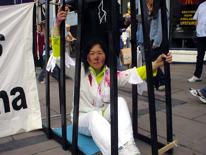 【明慧网2004年10月13日】上星期在爱尔兰第二大城寇克市(Cork)举办了一场反酷刑展,来自爱尔兰各地的法轮功学员聚集在一起,让人们知道现在正发生在中国大陆对法轮功学员的人权侵害。学员们介绍法轮大法,并将加诸在中国法轮功修炼者身上的许多酷刑方式模拟展示出来。