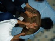 3、撅:两名犯人把法轮功学员按扒在地上,一名犯人用力掰手臂,一名用脚踩住臀部,用肩使劲向上抬腿,胯部酸痛难忍。