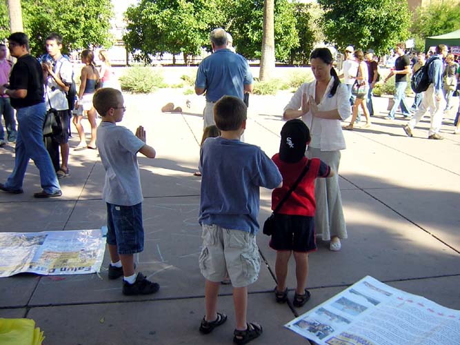 2004年10月13日,我们凤凰城的大法弟子与开车赶来的拉斯维加斯大法弟子,瑞典大法弟子,及图桑大法弟子一行15人来到亚利桑那州立大学的校园开始我们洪法讲真象的活动。我们在校园的中心地带摆设大法洪法图片,及揭露江氏流氓集团残酷迫害的酷刑展图片,一部分弟子随着优雅的炼功音乐炼起五套功法,一部分弟子向来往的人们散发真象资料。很多过往的学生及来访人员纷纷被我们的展位所吸引而驻足观看,我们在炼功的弟子面前摆上一些美丽的纸制莲花,不少人主动拿我们放在图片角上的真象传单并仔细观看,有疑问的主动向我们询问,也有不少人向我们索要莲花。很多看过酷刑展图片的人都被江氏集团的残暴所震惊,不少人不由自主地说“我的天,他们(江氏流氓集团)怎么可以这样灭绝人性?”“我的天,(江氏流氓集团)太残忍了。”有的人特地带朋友来看酷刑展图片,并把大法弟子告诉她的真象转述给她的朋友。