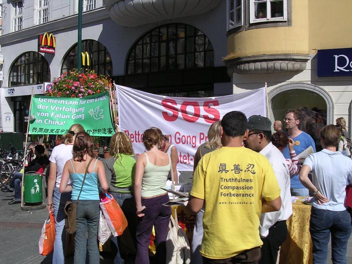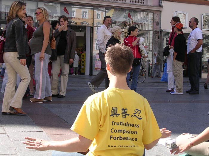 【明慧网2004年10月19日】法轮功学员在奥地利林兹市(Linz)电车站正对面主要的购物街的中心设置信息展位,提供电车旅客一个观看法轮功横幅及功法的机会。很多人都对法轮功有兴趣并纷纷取走简介。人们通过这个机会获知法轮功学员在中国大陆无辜遭受