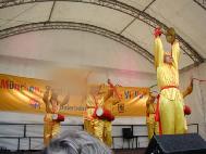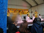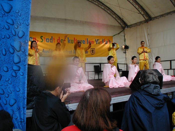 尽管天气不太好,时不时的就下上一阵小雨,但文化节精彩的节目还是吸引着大量的观众。来自不同国家和地区的各个社团,他们出色的表演不断赢得人们的阵阵掌声。法轮功学员也将腰鼓、舞蹈和法轮功功法展示带给文化节,给文化节又增添了光彩。当几位女学员表演舞蹈“莲花颂”时,优美的舞姿引来了许多闪光灯,太阳也从云层中露了出来,一束阳光就像聚光灯似的照在舞台上,仿佛天都在笑。学员们还表演了五套功法,观众们欣喜的接过学员递上的法轮功真象资料。