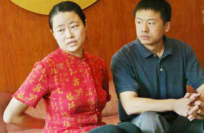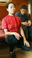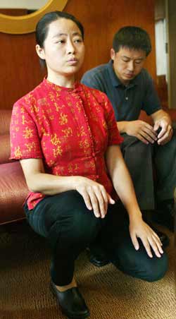 ![]() 周雪菲和她先生山姆-吕(朝晖)一起,示范她因炼法轮功而被关在劳教所时,被强迫保持很长时间的姿势。 |