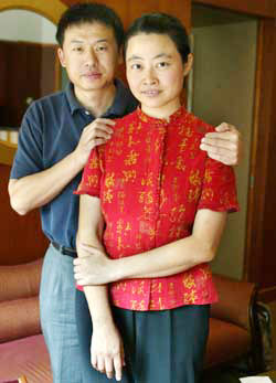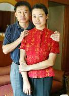 ![]() 周雪菲和丈夫山姆-吕(朝晖)一起,示范当她因修炼法轮功而被关在劳教所时,如何长时间被强制把双臂置于背后。 |