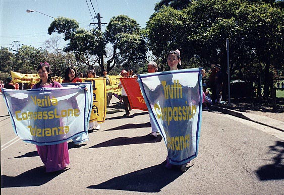 ![]() 学员们在游行队伍中手举不同语言写成的“真善忍”的小横幅: | ![]() 游行队伍 | ![]() 花车和功法表演 |