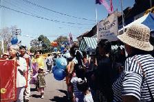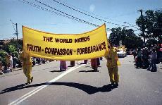 在游行开始的前一周,当地报纸上就提到法轮功团体将参加节日游行。当法轮功学员的花车、腰鼓队、唐装表演从观众面前缓缓走过时,鼓掌喝彩的不仅仅是西人,还有当地的华人。一家广东人在路边观看游行,男主人不断地说:“看,法轮功!法轮功!”一位女士微笑着向身着唐装的学员招手,学员见状问她:“你知道法轮功吗?”她微笑着说:“我了解,我都知道。”虽然她没有说什么,但那眼神中流露着对大法学员的敬意与友好。还有一对北京来的老两口,看到游行队伍中的西人学员,互相议论:“还有洋人哪!”路旁的法轮功学员给他们讲真象,老先生问:“你这么年轻,也练啊?”学员告诉他,趁在国外探亲的机会,多了解了解真象,老先生友善地与学员微笑致意。