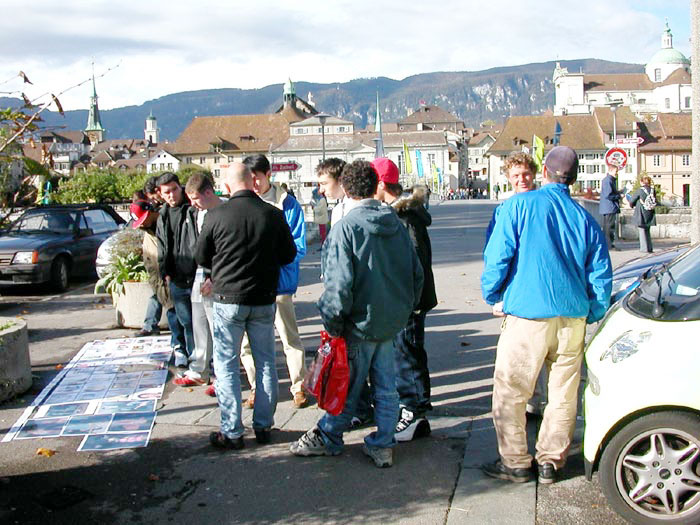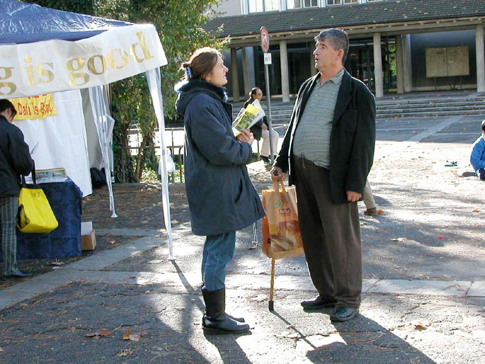 虽然当日气温骤降,但学员们不为所动, 按既定计划照常活动,反酷刑展览上,路人也纷纷停下观看,与弟子交谈,深为迫害真象所震惊。他们在呼吁书上签名,要求立即停止对法轮功学员的残酷迫害。