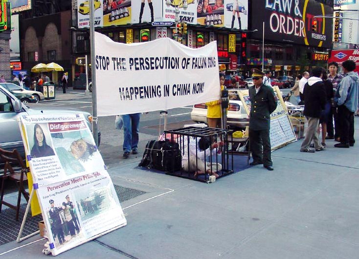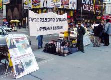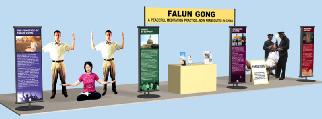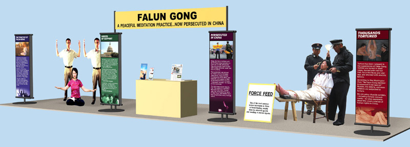 在摆放资料的桌子的另一边,他们做酷刑展,并摆放关于迫害的展板