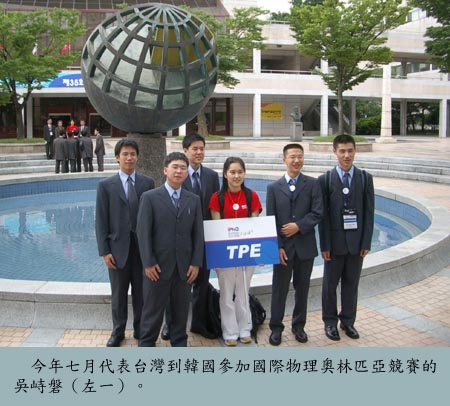 吴峙磐,一个悠游在围棋、足球、篮球、数学与物理天地里的活泼、乐观的孩子,从小就在各式竞赛过程中累积大大小小的经验,更在成败之间学习如何放下名、看淡得失,心中有着许多不为人知的甘苦。他说:“生命中的许多贵人、恩师庄立帆老师以及扮演黑脸的父亲,都是幕后功臣。”峙磐的金牌之路,得之不易。得奖后他在学校社团聚餐发表感言时,双手合十感谢神,这使修炼法轮大法的母亲黄惠燕女士感到非常欣慰。