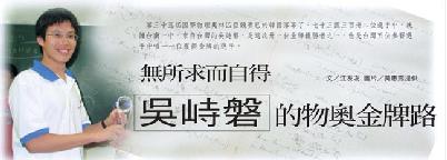 吴峙磐,一个悠游在围棋、足球、篮球、数学与物理天地里的活泼、乐观的孩子,从小就在各式竞赛过程中累积大大小小的经验,更在成败之间学习如何放下名、看淡得失,心中有着许多不为人知的甘苦。他说:“生命中的许多贵人、恩师庄立帆老师以及扮演黑脸的父亲,都是幕后功臣。”峙磐的金牌之路,得之不易。得奖后他在学校社团聚餐发表感言时,双手合十感谢神,这使修炼法轮大法的母亲黄惠燕女士感到非常欣慰。
