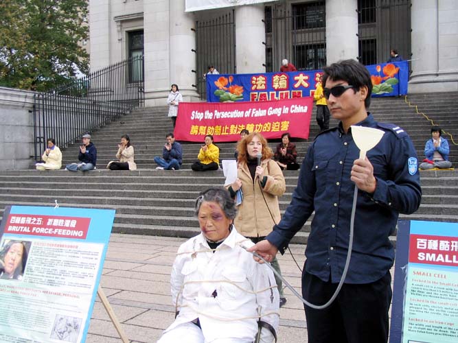 连续5个小时的酷刑展,学员们始终保持最好的精神状态。演示酷刑的学员一丝不苟,用自己的承受向世人展示中国法轮功学员遭受的迫害;化妆的学员认真负责,尽量做到逼真,以致常有观众走近演示者,问:你疼不疼?让我看看你的伤口。