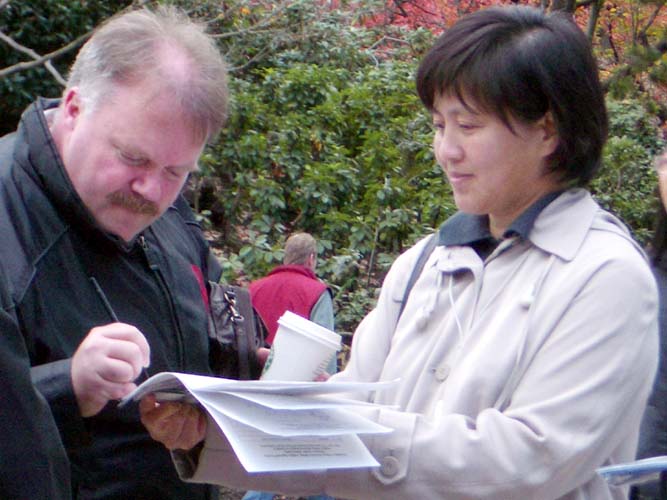 学员们一遍又一遍的向观看酷刑展的人们讲述着什么是法轮功及法轮功在中国受迫害的真象。法轮功学员小方说,讲真象中发现还有许多人不知道法轮功,他们常常问:法轮功是什么?看来我们讲真象还是很不够。