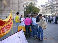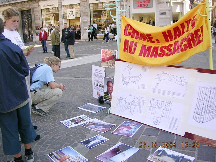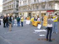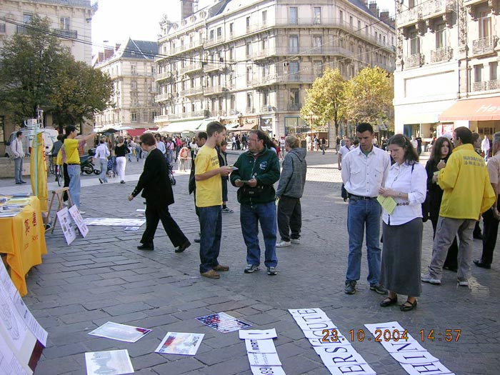整个一下午,大家共发出去了大量法轮功简介并征集了很多声援法轮功的签名。一张张江氏集团残忍的酷刑折磨法轮功学员的照片打动了很多过往的行人,一位母亲很动情的给她的两个孩子讲解着反酷刑展的照片,很多人当即就签了名支持法轮功学员反迫害。很多的行人都留下来和学员们做长谈,有的想进一步了解法轮功,还有的对法国总统访华时没有提出法轮功问题而向学员们表示歉意。