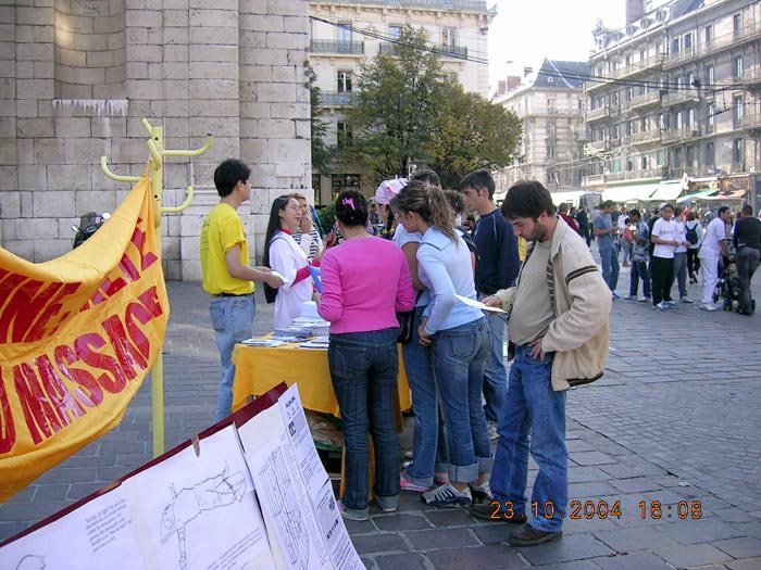 五套功法的展示也吸引了过往的行人。虽然在格勒诺布尔市有一个炼功点,但是,更多的人还是在今天才知道有法轮功的存在和他目前在中国被迫害的状况。