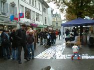 瑞士法轮功学员继在苏黎世、巴塞尔(Basel)、卢塞恩(Luzern)、伯尔尼(Bern)、索洛通(Solothurn)等城市举行了揭露江氏集团罪恶的酷刑展之后,2004年10月20日又在巴登市冒雨举行了酷刑展,部分德国法轮功学员也过境来参加了此次活动。