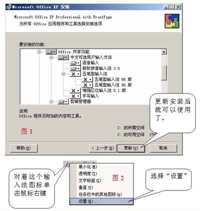 Office XP和Office 2003版本在安装时有语音输入法的安装,如图1。