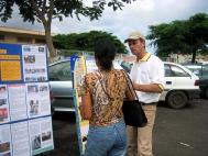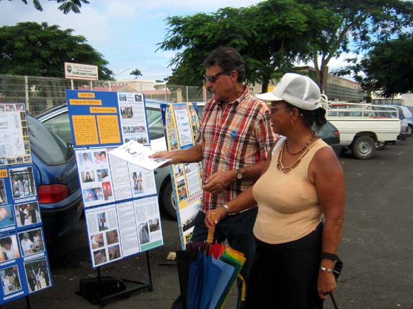 【明慧网2004年10月29日】2004年10月13日星期六,为了揭露在中国对法轮功学员严重的暴力侵犯人权现象,揭示其为了强行让法轮功学员放弃他们的信仰而使用的种种酷刑,法国瓜德鲁普省(Guadeloupe)马奥湾市( Baie-Mahault)的法轮功学员共同组织了一个图片展。
