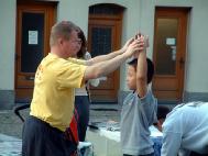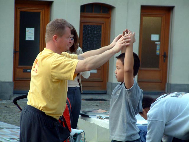 更令人感动的是,瑞士几位小弟子也认真的炼功和发正念。一位大约十二岁的瑞士儿童在旁边观看了很久,最后他对学员说,请你教我炼法轮功。真是教的投入,学的认真。他一直坚持学完了四节动功。最后合十表示感谢。