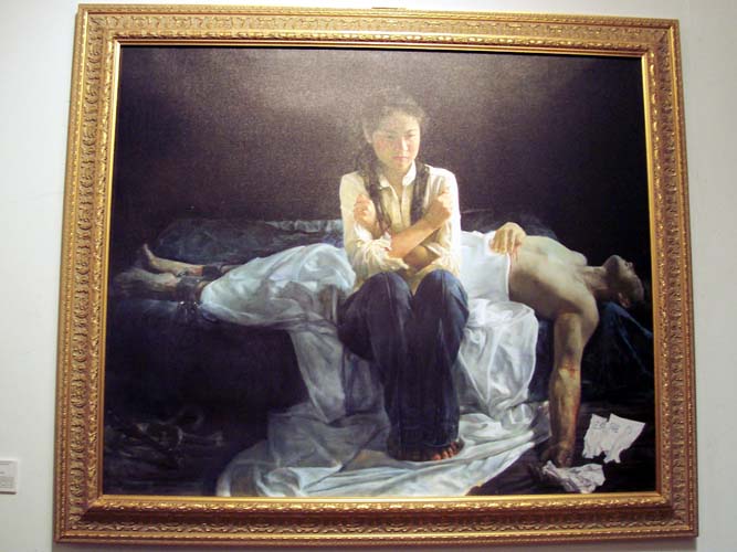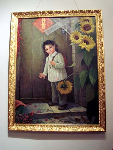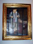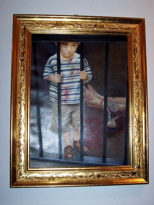 另一幅作品“为什么”,一位小男孩被关在笼子里,一脸茫然,两只大眼睛,没有恨,没有怕,没有泪,眼角有伤,身上有血迹。他的妈妈被戴着脚镣,躺在地上。此画的作者汪卫星女士说,这是她的朋友的故事。从男孩的表情,人们可以感受到,孩子小小年纪,在监狱里已待了一段时间,常常看到学员受迫害的情形,所以他已经没有怕,可是他实在不明白为什么修真善忍做好人会遭到如此严重的折磨。