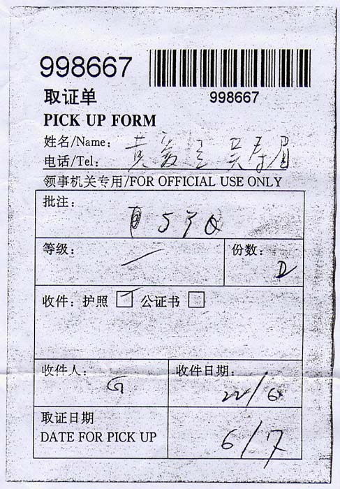 6月22日,我和我的先生吴寿眉一起来到领事馆办理我们的护照延期,窗口的女士给我们一份7月6日的取件单。