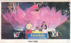 “哇!法轮功的队伍也来了!”有些韩国民众对法轮功还不是太熟悉。当法轮功学员出现时,观众们非常好奇。法轮功学员们穿着黄色的中国服饰,与装饰成莲花的优雅的花车一起出现在游行队伍中。李约翰,一位来自中国的留学生同时也是法轮功学员,自豪的表示:“为了准备参加游行,在杭庭顿海滩的一次游行前,我们用了一个月的时间自己制作装饰这部花车呢。”