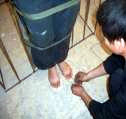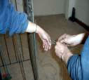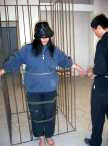 5月11日下午,恶警李国强强迫李慧欣背靠铁笼子,脚后跟紧贴铁笼子笔直的站着,双手分别铐在铁笼子上。他们怕虚弱的李慧欣站不住,又用三道绳子把她捆在铁笼子上,开始电击。恶警用小铁环套在李慧欣的双手及双脚的大拇指上过电(如下图所示)。恶警一直逼问她流离失所期间在干什么?这次恶警仍然没有得逞。他们看到用什么手段迫害都不顶用,后来就把她送到铁路公安分处。