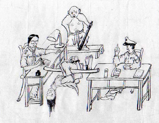 酷刑穿心杠:戴上手铐、脚镣,将两手铐紧,让人蹲下,两只胳膊抱膝,将铁杠从胳膊上腿弯处横穿。然后将杠子抬起,放在两张办公桌上,此时受刑人面朝上、背朝地。