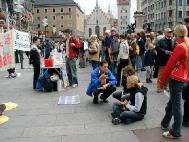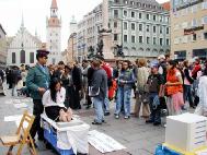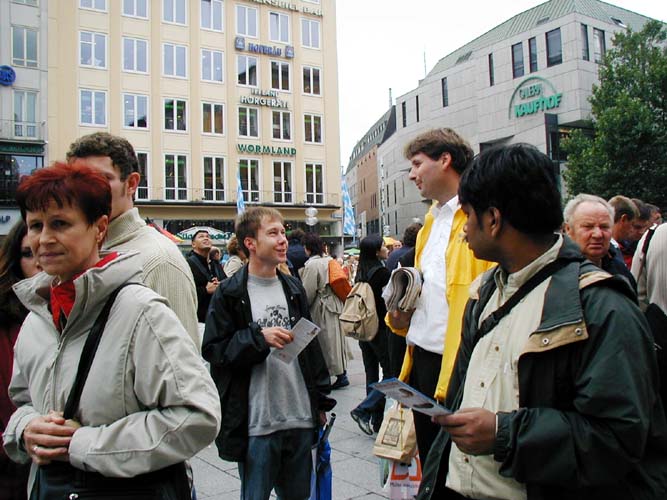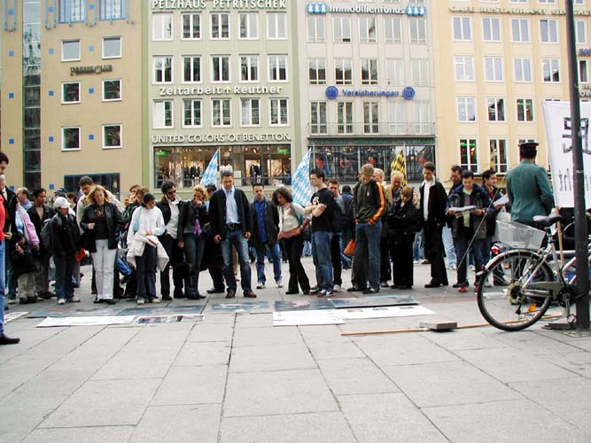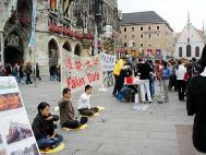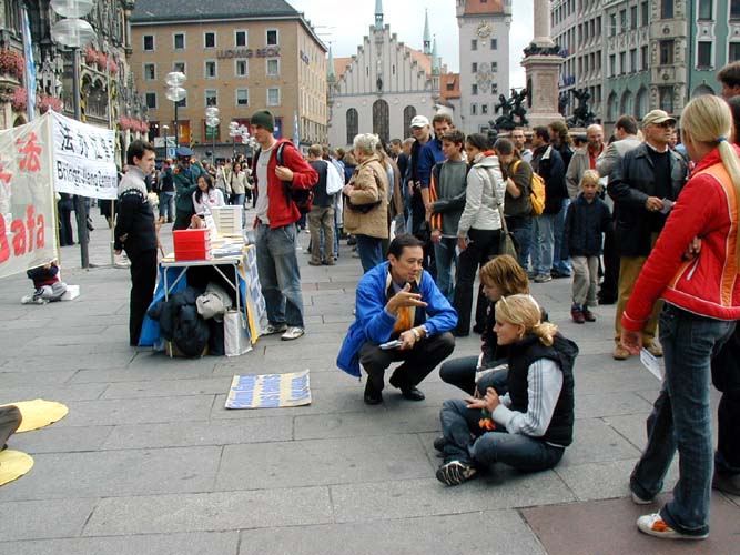 【明慧网2004年10月5日】二零零四年十月二日,一年一度的德国慕尼黑啤酒节落下了帷幕,来自世界各地的游客尚未离去,他们余兴未尽的在慕尼黑游逛,其中大多是意大利游客,坐落在闹市区的玛琳广场(Marienplatz)是他们的必经之地。