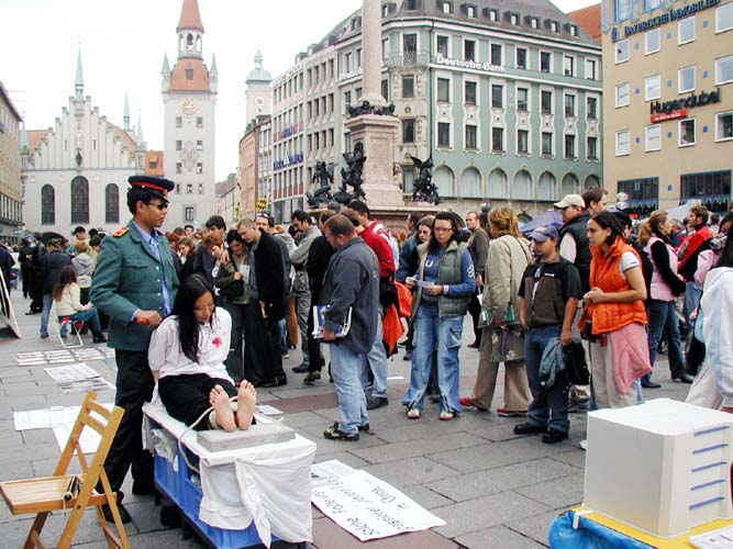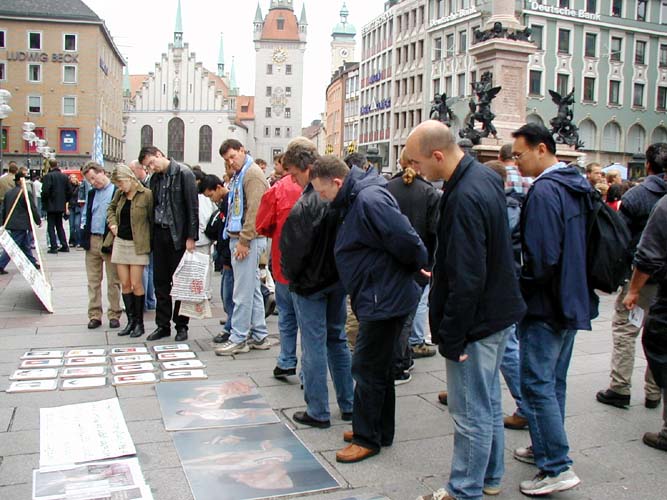 慕尼黑和周边城市的法轮功学员抓紧这一机会,在玛琳广场举办了包括炼功、图片展和真人模拟酷刑展示在内的讲真象活动。大幅的标语上写道“法办江××”,展台上还有一封感谢信,告诉大家经过多方的努力,前柏林工学院的法轮功学员熊伟被营救出来并顺利抵达德国,感谢所有为营救熊伟而付出努力的人们。