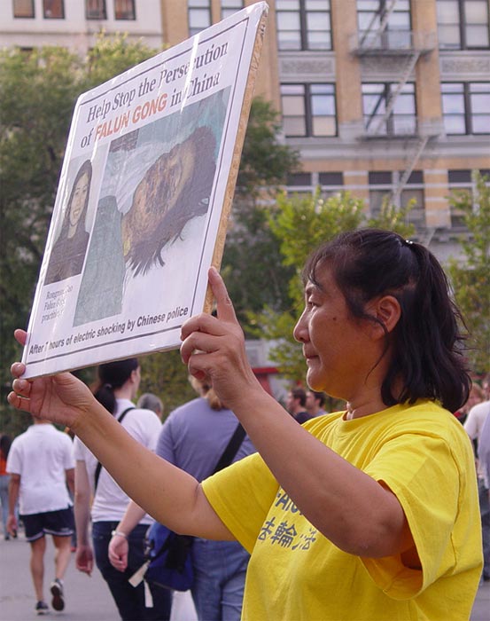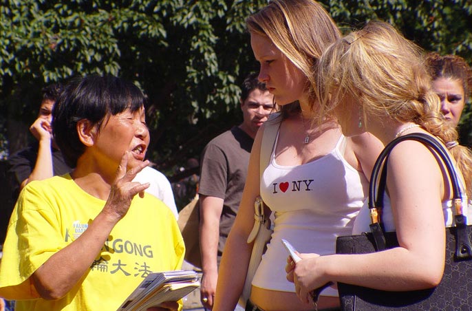 自从8月以来的几乎每一个周末,人们在纽约曼哈顿的联合广场(Union Square)上都可以看到一位身着黄色T恤衫、身体健硕的中年妇女在散发一种介绍法轮功的传单,有时她也会举着一面展板将法轮功学员在中国受迫害的图片展示给过往的行人。李(Li)女士――这位来自俄亥俄州一个中部城市的药厂技术员,同其他上百名美国中部地区的法轮功学员一样,以这样独特的方式在纽约曼哈顿的街道上度过了他们的大部分周末,尤其在这个号称大都会中的小镇的联合广场地区。